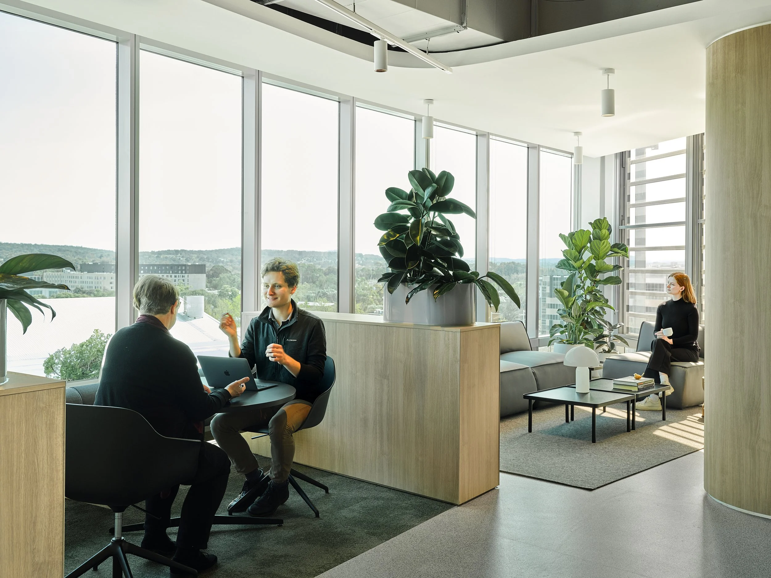 In plan, the form of the building and central core follows the radial planning of Canberra’s civic centre, with the main aspect facing towards Black Mountain, Lake Burley Griffin and the Brindabellas. The spatial planning is anchored by a town hall space, creating a dynamic entry experience for AMSA staff and visitors, and unifying business and social functions. Maximising access to natural light, the built form is arranged around the building core, creating an internal landscape that ebbs and flows, softening acoustics between active and social zones.